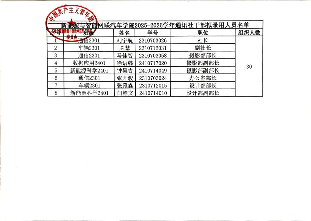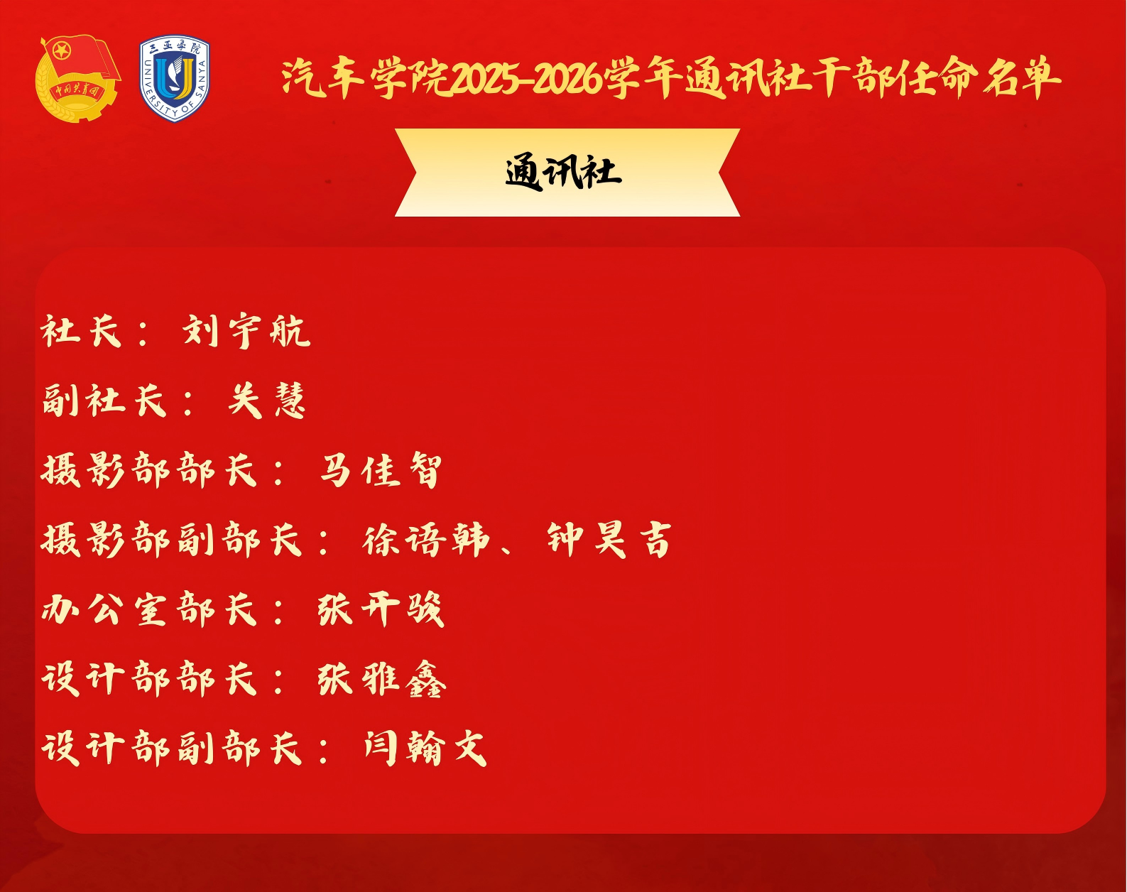 经过自主报名、公开竞选、综合考核等环节,7003全讯白菜网址新一届通讯社学生干部团队已正式组建完成!他们将在接下来的一学年里,以服务为笔,以热忱为墨,与全体汽车人共同绘制属于我们的青春画卷。现将名单公示如下,期待他们以热忱与担当,为学院建设贡献青春力量!
