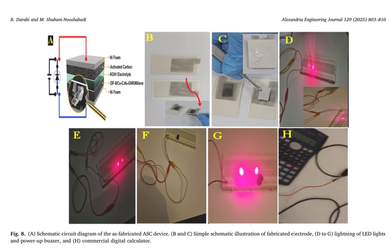 第一篇论文《ZIF-8/Co-C₃N₄-GNR/MXene纳米复合材料:一种具有优异电化学性能的超级电容器新型电极材料》发表于Alexandria Engineering Journal,提出了一种新颖的多组分纳米复合材料,采用简便的方法合成,将MXene、金属有机骨架(MOFs)及石墨烯纳米带(GNRs)有机结合。该材料表现出卓越的电化学性能,包括高达1125 F·g⁻¹ 的比电容,以及超过10,000次循环的稳定性,显示出其在下一代非对称超级电容器与先进电子器件中的巨大应用潜力。