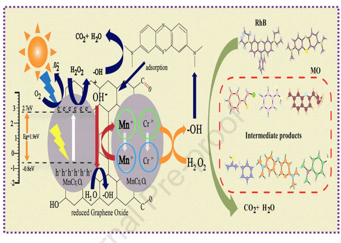 第二篇论文《还原氧化石墨烯介导的尖晶石铬酸盐ACr₂O₄ (A = Mg、Ni、Mn)纳米复合材料的协同潜能:结构、光催化与动力学研究》发表于Ceramics International,提出了一种制备基于rGO的尖晶石铬酸盐纳米复合材料的新策略。研究发现,MnCr₂O₄@rGO在太阳光照射下对有机污染物的降解率高达94%,同时具有良好的可重复使用性,凸显了该类复合材料在废水处理等环境修复领域的应用前景,并展现了其在能源相关技术中的潜力。