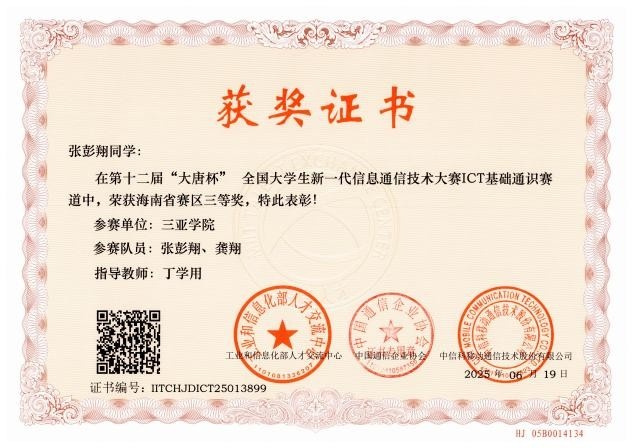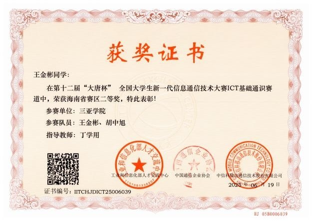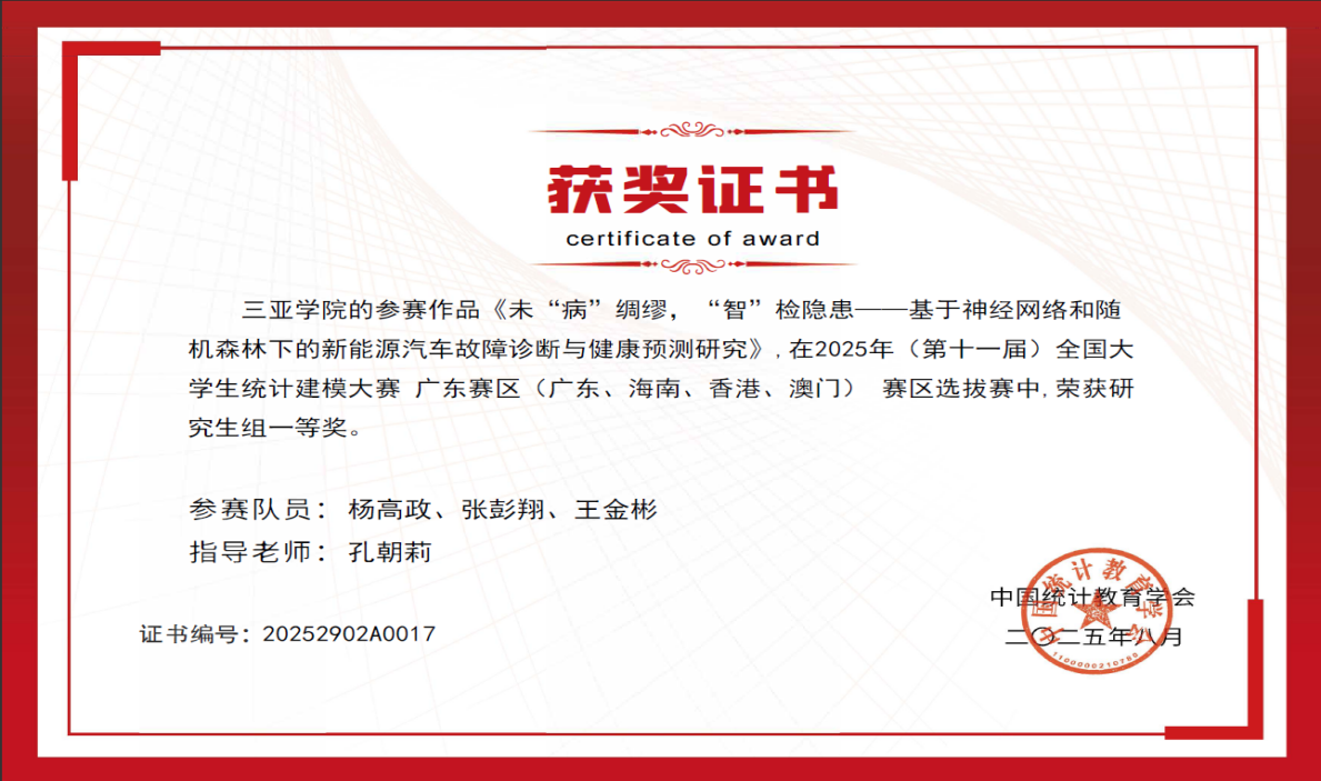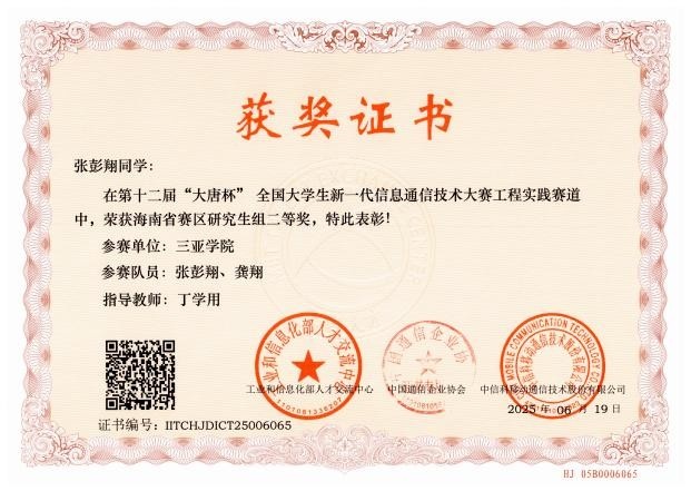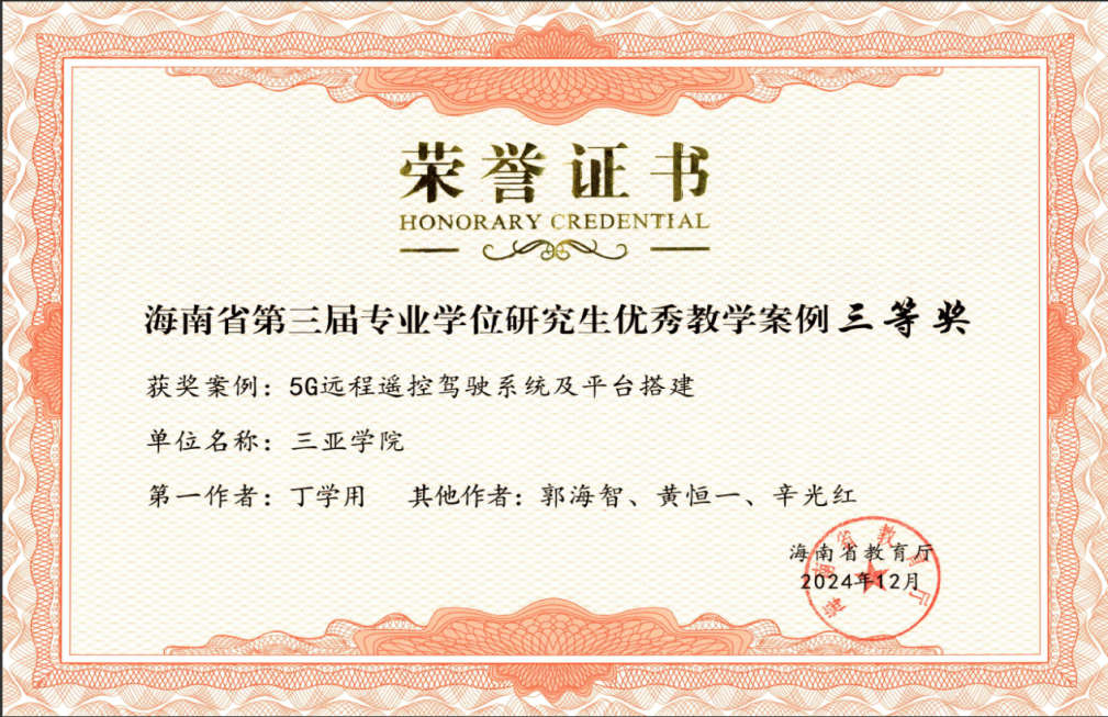 我院引导学生团队合作,参加科研实践,实现从“知识学习者”向“成果创造者”的跨越。以教学改革为切入点,努力培养学生的创新能力,有目的地引导同学们组成多学科交叉科研团队,合作参加科研实践项目和学科竞赛,接触前沿课题。2024级研究生宋辰玚同学立项1项2024年海南省研究生创新科研课题(智能汽车实时状态共享与智能决策系统研究,项目号:Qhys2024-517),2024级研究生胡中旭同学立项1项2024年7003全讯白菜主站校级研究生创新科研课题(基于深度学习驾驶员状态监控与主动干预系统研究,项目号:USYQhys2024-08)。2024级研究生参与导师项目共发表学术论文6篇,其中SCI收录3篇,EI收录1篇。杨高政、张彭翔和王金彬团队在2025年(第十一届)全国大学生统计建模大赛广东赛区选拔赛中,荣获研究生组一等奖;胡中旭、王金彬、辛凤凯团队和江启山团队分别在第六届国际青年人工智能大赛国际自贸港科技创新主题赛中获海洋科学与深海科技赛项省赛一等奖,胡中旭、王金彬、辛凤凯团队并在总决赛获得国赛一等奖;在2025年第十二届“大唐杯”全国大学生新一代信息通信技术大赛中,7003全讯白菜主站7003全讯白菜网址硕士研究生团队荣获海南省赛一等奖1项、二等奖2项和三等奖1项。
