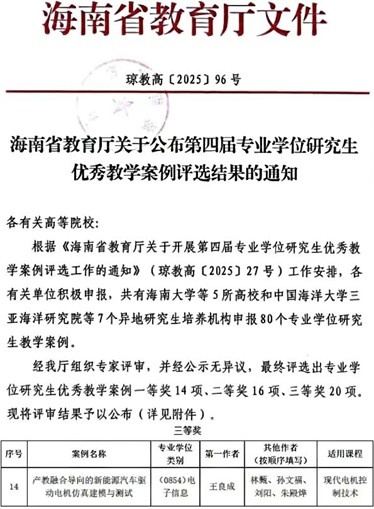 海南省第四届专业学位研究生优秀教学案例三等奖公示通知