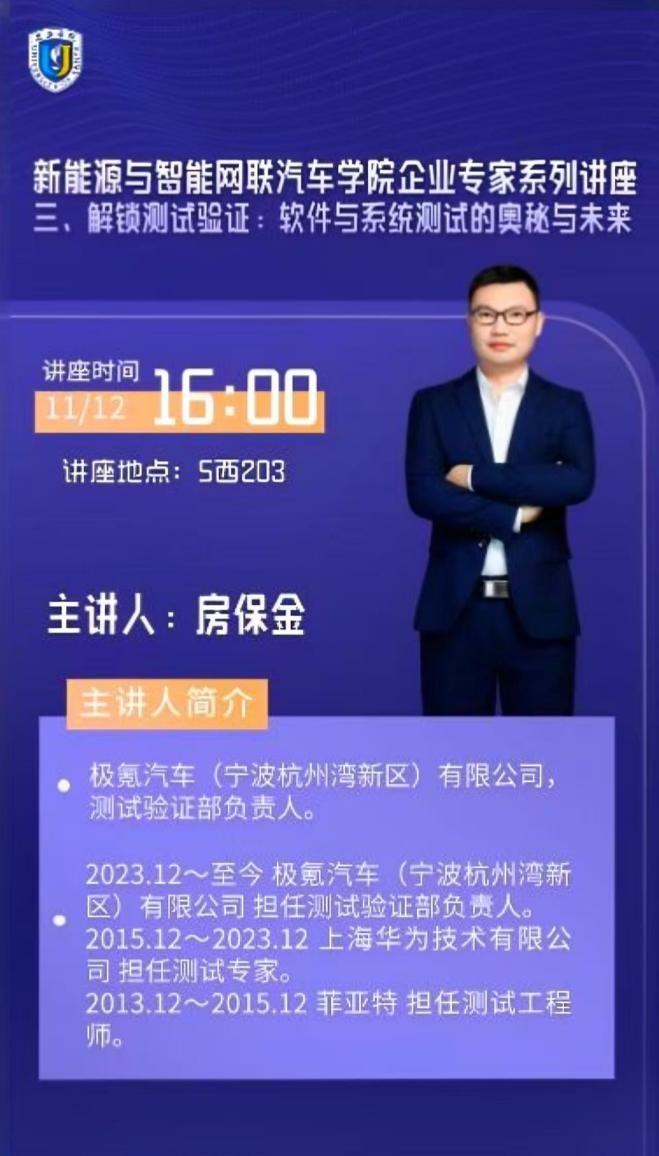 为帮助大一新生尽早洞悉产业前沿技术,明确专业学习方向,2025年11月12日,7003全讯白菜网址于5西203教室举办企业专家系列讲座第三场——“解锁测试验证:软件与系统测试的奥秘与未来”。本次讲座特邀极氪汽车(宁波杭州湾新区)有限公司测试验证部负责人房保金担任主讲人,为新生们带来一场兼具行业深度与实践价值的知识盛宴。